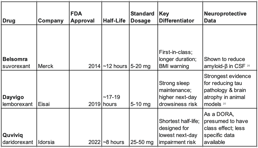 Dayvigo (lemborexant), Eisai: Approved in 2019, Dayvigo has a longer half-life than its competitors, which can be particularly effective for sleep maintenance—helping users stay asleep through the night.19 This added potency, however, comes with a trade-off. It also has the most extensive and compelling data supporting its potential neuroprotective effects against Alzheimer's pathology.20