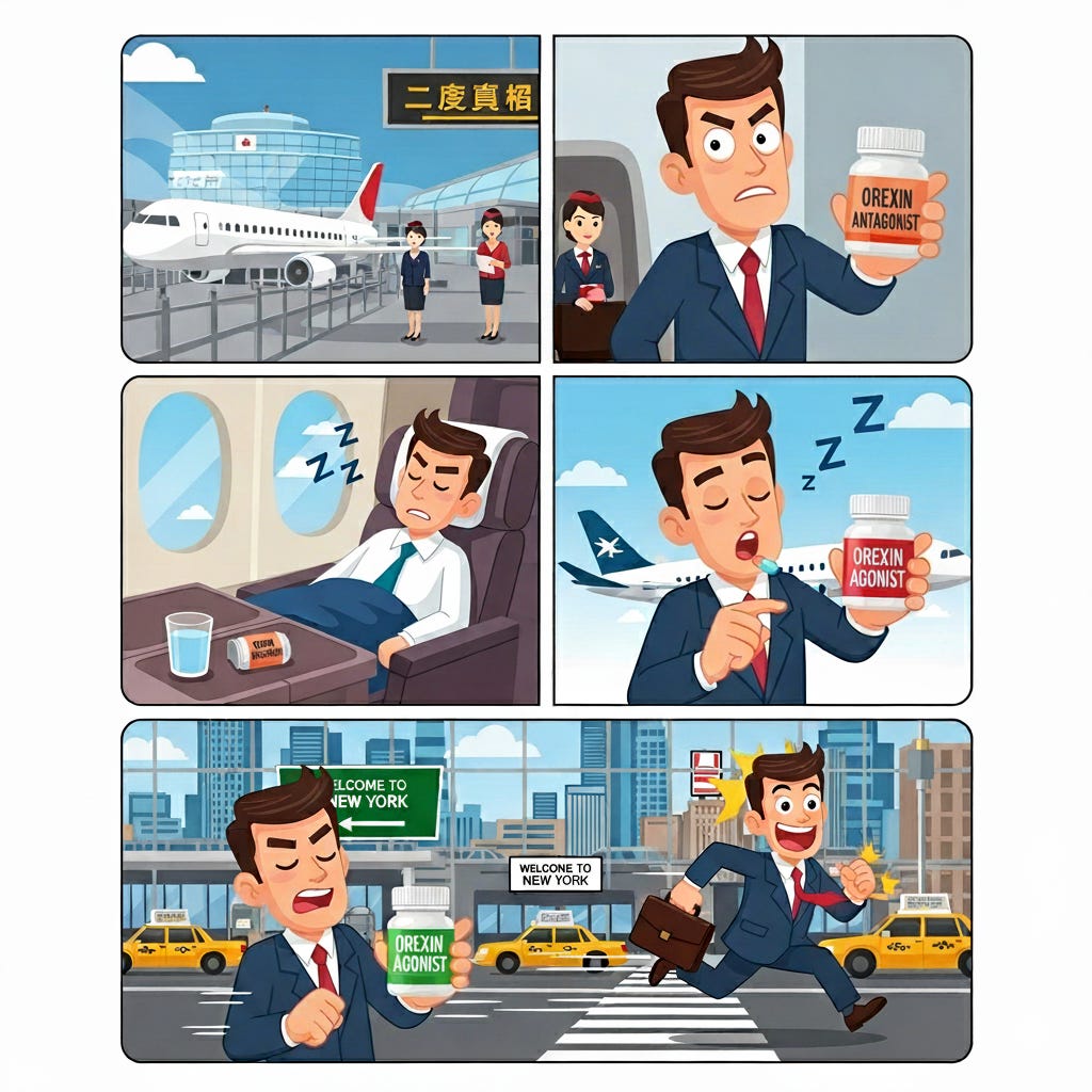Imagine a future scenario: A global executive facing a critical negotiation in Tokyo takes a precisely-timed dose of an orexin antagonist like Dayvigo or Quviviq upon boarding their flight, experiencing eight hours of deep, restorative, neuro-protective sleep. Upon landing, instead of battling days of debilitating jet lag, they take a dose of an orexin agonist like oveporexton. Within an hour, they are in a state of crisp, unwavering alertness, cognitively sharp and ready to perform at their peak for the next 16 hours. This is the ultimate biohack: the complete and deliberate control of the human sleep-wake cycle, divorced from the constraints of geography and time zones.